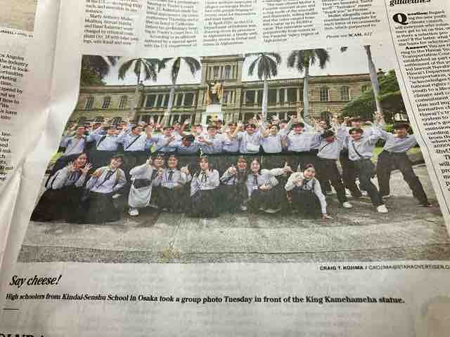 新聞に載っていたカメハメ大王像前の集合写真に目が入った。日本ではよく見られる制服で等一された高校生たちの集合写真だ。写真の説明には、大阪にある近畿大学泉州の生徒たちとある。