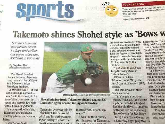 昨日の地元レス・ムラカミ・スタジアムで行われたUCデービス(カリフォルニア州)戦では、先発投手として7イニングを投げて7奪三振、打っては4番打者としてチャンスで2塁打を打ち2打点をあげた。結果は7対2でハワイ大学の勝利に貢献した。 武元は過去2回の先発で防御率2.31を記録し、これが3回連続のクオリティスタートとなった。90マイル以上の速球を投げる武元は、7イニングで四球0、奪三振7と見事な投球だった。