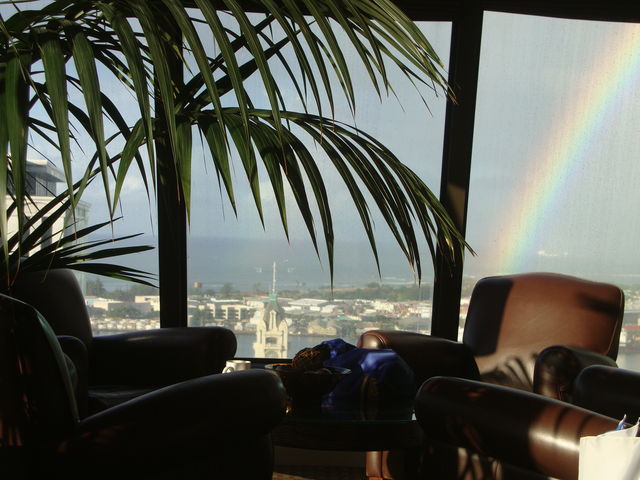 朝のシャワーが陽に照らされてホノルル港に虹をかける。お気に入りの空間で過ごす、つかの間の時間は私の大切な時間だ。