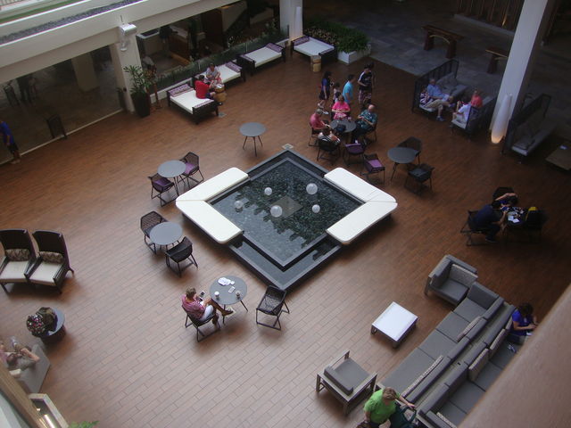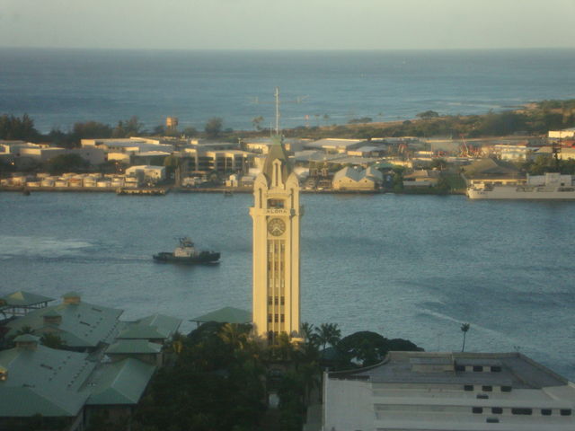 窓の外に目をやると、ホノルル港に出入りするさまざまな船を見ることができる。ワイキキ沖で潜水する観光潜水艦も曳航されて港を出て行く。