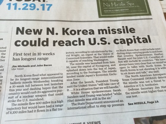 28日の弾道ミサイルは、アメリカ本土をじゅうぶんに射程に入れる可能性があると言われています。専門家に寄れば、8100マイル(13000キロ)も飛ぶミサイルで、アメリカ東海岸の首都があるワシントンDCまで届く可能性があります。グァムやハワイどころではありません。