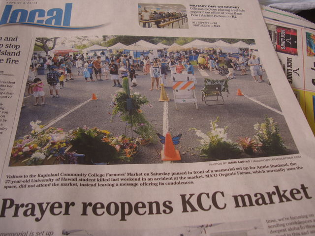 まずは、最近は旅行者に人気の高いオアフ島のKCC(カピオラニ・コミュニティ・カレッジ)で開催されているファーマーズ・マーケットで起こった事故です。15日(土)の早朝KCCの駐車場で26歳のハワイ大学生がマーケットの準備をしていると、バックしてくる20代の女性が運転するトラックにひかれました。26歳の女学生が亡くなり、2人が怪我をする惨事になりました。