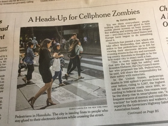 ホノルル市は、歩行者が携帯電話などの電子機器を使用しながら横断歩道を横断することを禁止する歩きスマホ禁止法を今日から施行しています。ニューヨーク・タイムズでも、アメリカの主要都市では初めての禁止条例を大きく取り上げています。掲載されている写真はホテルストリートのロングス&ロス前の歩道です。
