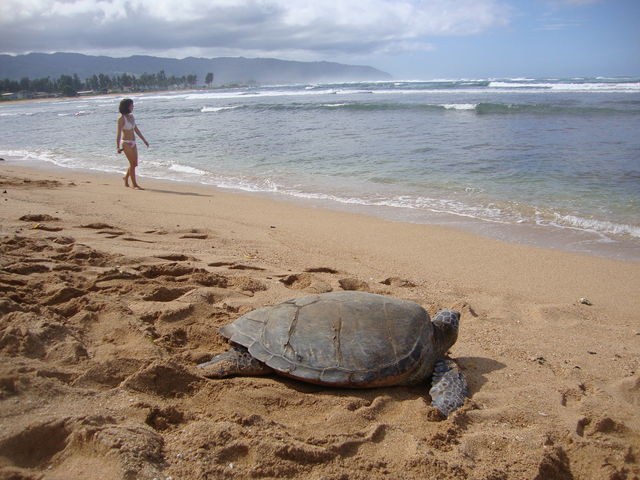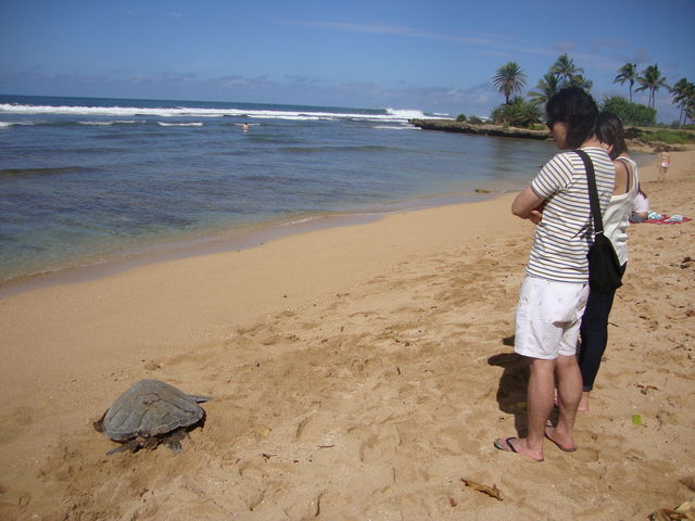 ハレイワのアリイビーチは、天気のいい午後にはビーチに海ガメが上がってきます。いつも見られるビーチで甲羅干しする海ガメが最近見られません。こんな場合は海に目を移すと、波間から何頭もの海ガメが顔を出しているのが見えるものです。