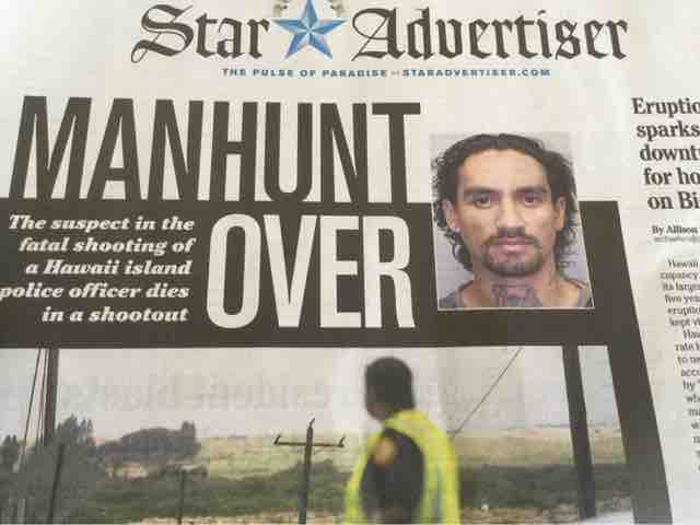 火曜日の午後3時前、ハワイ島で怪しい車両を2人の警官が止めました。1人の警官が車両に近づくと、突然に運転手の男が発砲して、46歳の警官を射殺しました。男はもう1人の警官の反撃から逃れ、現場から走って逃げ切りました。