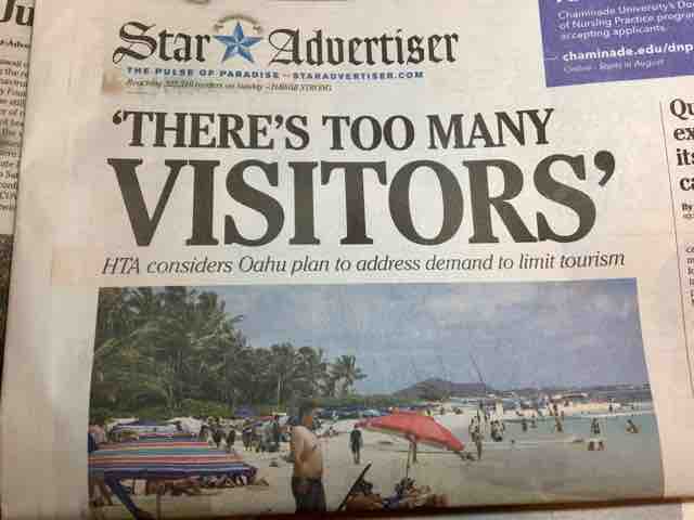 今日の新聞のトップは、「あまりに多い観光客」として今のハワイが抱える問題を紹介している。増えた観光客で問題が発生しているのは、マウナウィリ・フォールズだけでない。駐車場やトイレのないラニカイ、マカプウなどにも観光客が溢れている。亀ビーチのラニアキア・ビーチ付近は大渋滞で、付近の住民は悲鳴を上げている。