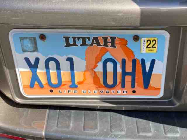 ユタ州のライセンスプレートの絵柄は、ユタ州の自然の神秘であるデリケート・アーチだ。数億年の地殻変動や侵食作用によってできた、アーチ状の岩がユタ州には2000もあり、その中でも一番だと言われるのがデリケート・アーチだ。7階建てビルほどの高さがある。