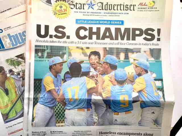 ホノルルリトルはオダ監督、オダ&カトーコーチの基で、今年のワールドシリーズ(世界大会)参加20チームの中で、投打にバランスのとれた過去10年で最強のチームとして今大会を魅了した。今日の世界大会決勝戦でも、ゲーム開始後1番、2番バッターが連続してホームランを打つなど、今までに見たこともない強さを見せてくれた。ゲームは13対3で圧勝のコールド勝ちだ。