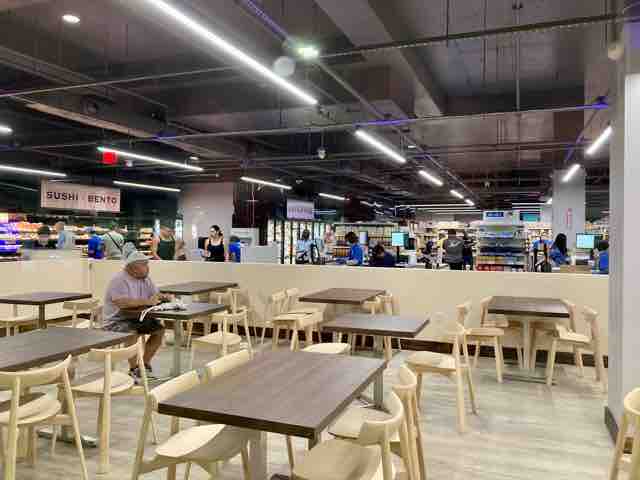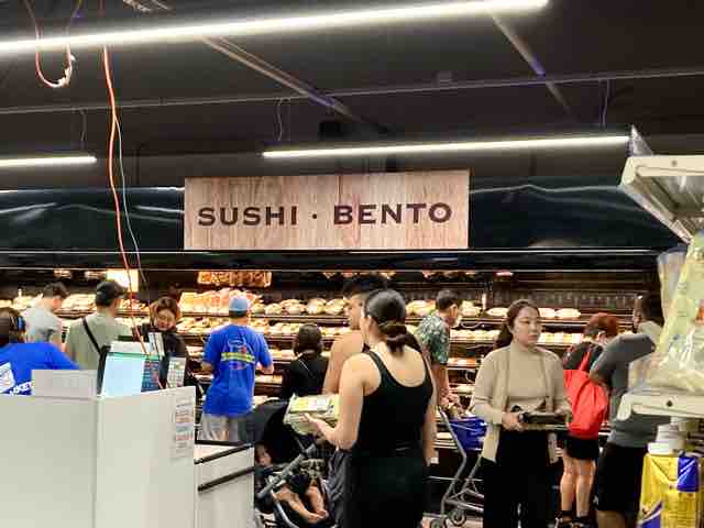 ニジヤは移転して今まで以上ににぎわっているようだ。店舗が広くなり、店内にイスとテーブルが用意され購入した弁当などが食べられる。アラモアナセンターならば、私たち移住者だけでなく観光客も手軽に利用できるスーパーマーケットとなる。