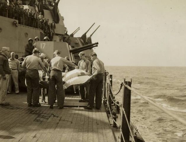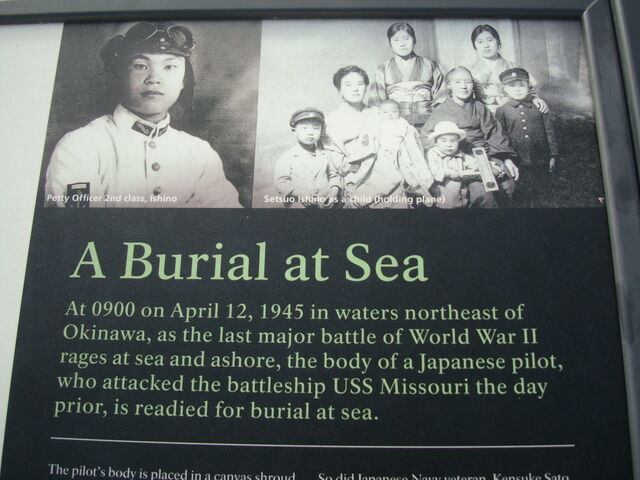 戦艦ミズーリのウィリアム・キャラハン司令官は、敵機ながら海軍の伝統に従って若い日本人パイロットに適切な海葬を行うよう命じた。遺体にはアメリカ国旗に日本の国旗を描いて覆って、遺体を海に沈める水葬式を執り行った。戦艦に特攻した身元が判明したのは2001年で、ミズーリ艦上で鹿屋基地を出撃して戦死した特攻隊員の遺族が招かれて慰霊祭が開催されている。