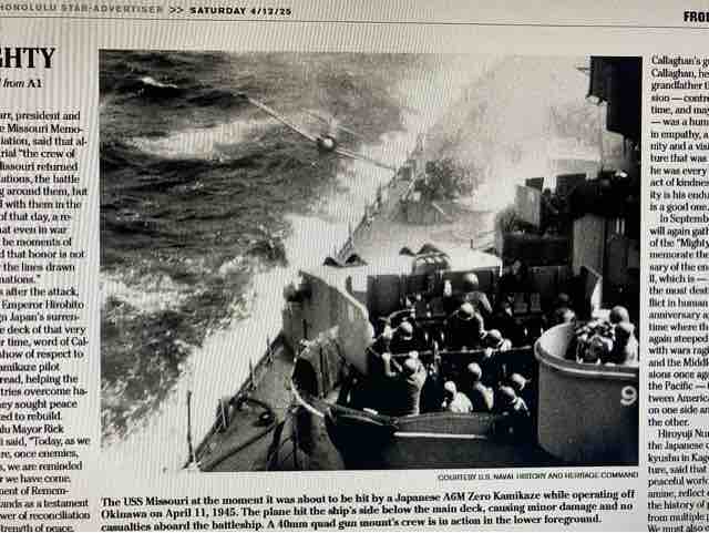 昨日この出来事の80周年を記念し、パールハーバーの海上に停泊するミズーリ艦上で追悼式典が開催された。式典には、ウィリアム・キャラハン司令官の孫と、日本海上保安庁の司令官ら要人がハワイを訪れ式典が行われた。