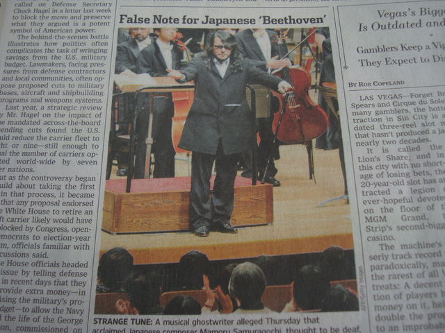 今日の昼のNHKニュースのトップニュースが話題の聾者の音楽家の記者会見でびっくりしました。醜い三面記事が日本のトップニュースです。発覚当時は、NYタイムズやウォールストリートジャーナルのアメリカのメディアでも紹介されていました。