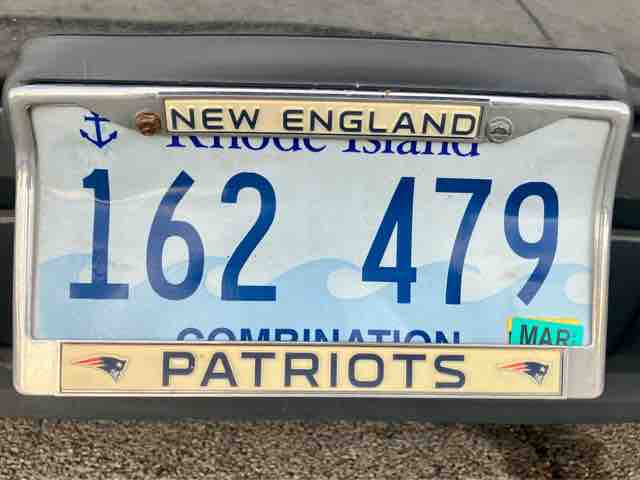 ロードアイランド州のライセンスプレートの左上には、州旗のデザインにもある船の錨⚓️マークがある。ネイビーブルーの数字の背景は、州の愛称である海洋(Ocean State)の5つの波が描かれている。プレート枠は、もちろんプロアメフトチームのニューイングランド・パトリオッツの物だ。